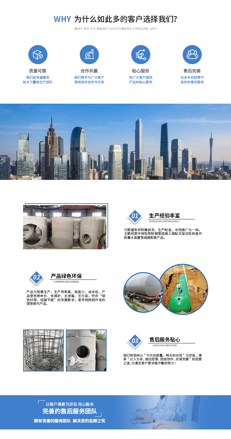 黃山市萬(wàn)順建筑科技有限公司是集研發(fā),生產(chǎn)制造,市場(chǎng)推廣為一體的綜合性企業(yè)。公司主要經(jīng)營(yíng)環(huán)保型預(yù)制鋼筋混凝土裝配式組合型檢查井和蓄水裝置等城建配套產(chǎn)品。產(chǎn)品生產(chǎn)過(guò)程采用獨(dú)特的生產(chǎn)工藝,機(jī)械化流水作業(yè)。產(chǎn)品大規(guī)模生產(chǎn),生產(chǎn)效率高,耗能少,成本低,產(chǎn)品使用壽命長(zhǎng)、免維護(hù)、無(wú)滲漏、無(wú)污染,符合“綠色環(huán)保,低碳節(jié)能”的發(fā)展要求,是傳統(tǒng)磚砌井池的理想替代產(chǎn)品。